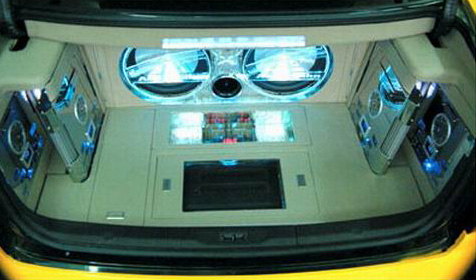 這部車的系統中,一共使用了四部 Audiobahn 功率擴大機,其中兩部功率較大的 A2601Q,分別驅動裝在音箱中的一對 Alum 12Q 鋁合金震膜超低音單體,由于12Q是雙音圈的結構,每個單體的兩個音圈以并聯的方式,分別各自接駁到以單聲道橋接模式的 A2601Q 來驅動,此時的阻抗為兩歐姆,可壓榨出擴大機更大的功率輸出。另外兩部功率擴大機,是輸出功率較小的 A2301Q,其中的一部用來驅動前音場喇叭,采用的是德國 Rainbow 的兩音路喇叭 CS265P,屬于這個品牌相當高等的型號,可見車主對于聲音的要求。前音場的高音和低音單體,都安裝在原廠的喇叭位置上,因此由外觀完全看不出改裝過的模樣。另外一部 A2301Q 擴大機,驅動的不是位于后座門板上的后喇叭,而是驅動一對安裝于行李箱蓋內的 JBL 早期單體,為四吋金屬震膜大型凸盆中高音喇叭,安裝在這里想必一定也是為了對外播放而設計的,因為這個尾廂蓋內兩個喇叭中間還有螢幕。