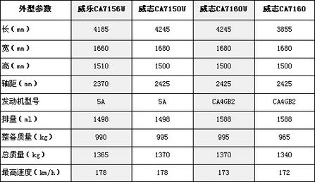 下表為威樂、威志三廂版1.5L、1.6L車型以及威志兩廂版1.6L參數對比: