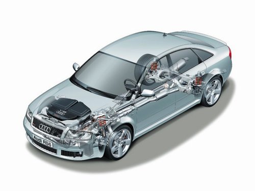 RS 6 的最后組裝會在奧迪位于德國內卡蘇爾姆的 quattro GmbH 工廠進行,該廠是奧迪AG 的子公司,主要生產奧迪的超級車型,除了現在生產的 RS4 和 6 以外,quattro GmbH 還可以根據個人要求定制,包括一些附加的部件、動力輸出的選擇以及打上奧迪的標記。4.2升 V8 的引擎也由 British-based Cosworth Technology 生產,該廠同樣也是奧迪的子公司,在勒芒大獎賽中奪冠的奧迪 R8 搭載的引擎就是由該廠生產的。RS 6 上的這臺引擎源于 S6 車型,對于 S6 來說,340匹的馬力已是綽綽有余,這次經過改進,馬力增大到450匹,引擎是全鋁材質,并且每個氣缸都增設 了一臺渦輪增壓器和中央冷卻器,每個氣缸采用3進2出共5個氣門以及一套全新的 Bosch Motronic 引擎管理系統,進氣和排氣系統也進行了重新設計,廢氣的排放與渦輪增壓起到了很好的配合,尾部采用雙排氣管的設計。其他的改進還包括把汽車的電瓶移到了汽車后部,空氣慮清器的位置也重新進行布置(位于引擎的正上方,并采用碳纖維的材質),所有這些的改進都是為了改善汽車的前后車重比。