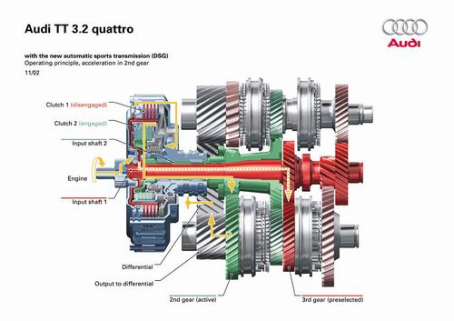 這套雙離合器系統所采用的技術是全球獨一無二的,最初一直用于比賽車型中,早在1985年,Walter R?hrl就已經成功的在他的奧迪賽車 quattro S1 中完成了測試。今天,經過重新設計的這套系統可以滿足任何換擋的苛刻需求,并且可以在量產車型中采用,適合于日常的頻繁使用。這套系統由位于卡塞爾的生產車間完成,該系統可以承受高達350牛米的扭距。