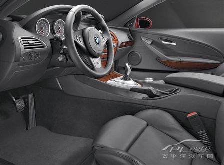 BMW M6的標準裝備增加了高級美利奴品質的真皮,有黑色、銀石和雪邦三種顏色。這種真皮內飾包括座椅、中央控制臺、手制動器手柄、車門板、扶手及門把。后排的側圍也采用了真皮裝飾。