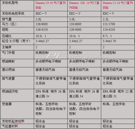 Duratec 20E發動機是Focus S、SE和SES系列在加利福尼亞、馬薩諸塞州、紐約、佛蒙特州和緬因州的標準配置,在亞利桑那州、內華達州、美國新罕布什爾州、新澤西州、俄勒岡州、賓夕法尼亞州和羅得島州則作為可選配置。