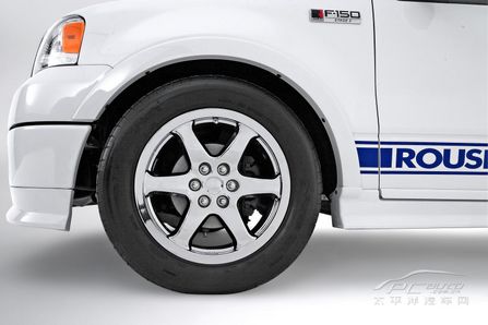 ROUSH Stage 3 F-150 套裝同時還有20英寸的輪緣以及輪胎,它們都來自于ROUSH Performance wheels。車身外部的組件還包括前導流板,帶有特殊通風口的炭纖維材料的引擎蓋,以及可以選配的側裙邊,帶有雙排氣尾管以及尾門導流板。內部經過特別設計的儀表盤,可以個性化的真皮坐席,鋁制踏板,刺繡型汽車用地毯等等。當然,每一輛ROUSH都會有一個號碼牌,標志著自己是出自于密歇根州ROUSH生產廠經過專業訓練的技術人員之手。