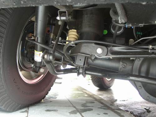 在車身的下部則可看見前懸架為扭桿彈簧式獨立懸架,后懸架為新開發的五連桿式螺旋彈簧獨立懸架。由此帶來的在一般道路上了乘坐舒適性和操控性能都比非獨立懸掛好,并提供給悍馬H2出色的穩定性和越野技能。堅固的后軸設計相當的耐用持久,能應付復雜的越野條件。除了這些外部看得見的,悍馬H2的車身內部還裝載了一套自動校正得空氣懸掛控制系統,能隨時保證H2擁有最佳狀態的越野能力。