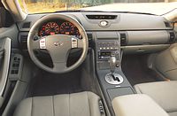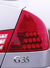 Skyline 車迷不會在 G35 車上找到標志性的四圓尾燈,取而代之的是占據車尾兩角的梯形尾燈。頭燈組則與 XVL 概念車上的一樣,反映出 QX45 的形象,前安全桿兩側的轉向指示燈是新設的。全車由圓滑的線條構成,流暢且富有進取感,但絕對不適合扮演好勇斗狠的角色。盡管有著師承淵源,畢竟已是改名易姓,另立門派的車款,本地 Skyline 的忠實車迷亦要對之另眼相看,不必感到失望。