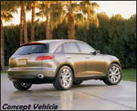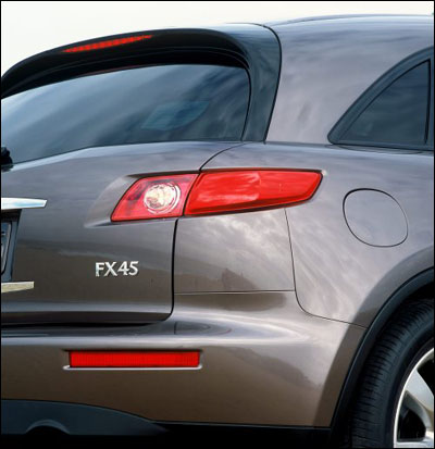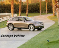 官方首次正式公布2003 Infiniti(無限) FX45車型的照片,這是一臺充滿跑車味道的SUV,強勁的性能配合杰出的操控打破了傳統(tǒng)的設(shè)計,該車的正式展出會在2003年1月6日舉辦的底特率車展上,動力方面會搭載一臺4.5升的V8引擎。現(xiàn)在知道的詳細資料只有這些,請留意太平洋汽車網(wǎng)的報道。(圖片可點擊放大)