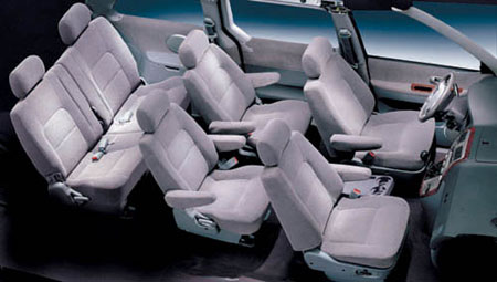 內廂寬敞舒服座椅的布置是2十2十3模式,中間為走道,后排兩邊雙開門,上下十分方便。后排座椅的軌道很長,可以收折后向前移動,當4人乘坐時能提供長1,024m m、寬1,625mm、高1,235mm的超大行李空間。中排座椅的設計最出色,不僅象前排座椅一樣有手枕,更可以向后旋轉180度,中排與后排面對而坐,方便乘客在車上交談和娛樂。中排座椅的靠背放平后還可以作臨時的餐臺或工作臺,上面有固定的杯座,同時車廂邊有12V電源插座,隨時可以接上手提電腦和其他電子娛樂設備。倘若停車休息,可以把中排座椅的靠背放平,與后排相連成一張床,小睡一會也很舒服。
