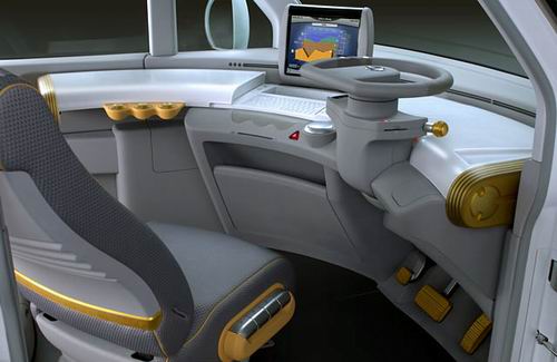 方向盤可以向上折疊,折疊后毫不影響駕駛員的進出。而方向盤的旁邊就是一個工作臺,打開工作臺的面板后,一臺個人電腦就呈現在眼前,駕駛座椅可以轉動到正對電腦屏幕和鍵盤的位置上,一切就像在真實的辦公室一樣。