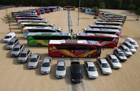 2006年世界杯馬上就要開賽了,雖然是以足球為主,但世界杯仍然少不了汽車秀的機會。此次各個國家隊的大巴圖案設計由國際足聯、世界杯組委會、德國足協及國家隊共同決定,波浪形主圖案寓意世界杯期間德國國內甚至全世界高漲的足球熱情,只在大巴最前面和最后面才能看到國旗的小圖案,美國是唯一沒有國旗圖案的國家。
