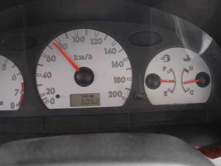 我和老婆不僅一陣興奮,這意味著如果我們依照這樣的情況行駛下去的話,我們很有可能會突破1000公里的大關,這是我們以前想都不敢想的事情。記得出發前接受記者采訪的時候我們說,“我們的車平常駕駛的時候最長距離是行駛600公里,這次我們的目標是突破800公里。”1000公里,真的是想都不敢想啊。正當我們得意的時候,前面出現了一段搓板路段,為了保持時速我不敢剎車,結果車就在路面上猛烈的顛簸,真的是好心疼我的愛車啊。好不容易過了顛簸路段,再一看油表,嚇了我們一跳。油表指針猛然間又下去了一大截,怎么落的這么快,完了,看來挑戰1000公里只能是個夢了。正惋惜的時候,突然老婆興奮的喊道:“看,油表又回來了!” 我一看,果然油表又回到了剛才中線稍微偏下一點的位置,于是我明白了,原來是顛簸的時候
