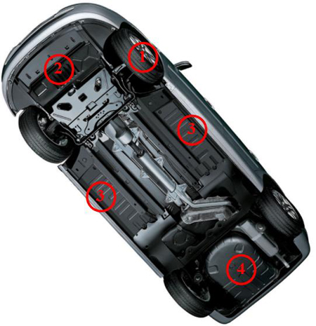 3. 加厚了底盤防銹減噪的PVC封塑涂層:為了在中國(guó)使用情況下保證車底盤12年不銹,鋼材大部分使用進(jìn)口,使用了特別工藝進(jìn)行處理。首先是基礎(chǔ)好:使用的是進(jìn)口雙面鍍鋅鋼板,而且使用了非常復(fù)雜的電泳底漆處理。其次是工藝好:對(duì)所有焊縫都用防銹膠封閉(黃色的,可以看到)最后就是用料考究:在底漆之外,整個(gè)底盤都進(jìn)行了封塑處理,在④這個(gè)位置可以看得很清楚。