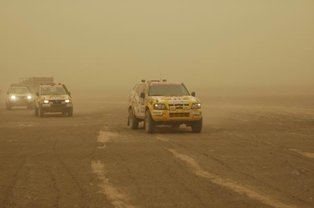 回顧已結束的賽程,艱辛困苦仍歷歷在目。4月29日第一個行駛路段的興奮只延續了幾個小時,之后的沙塵暴天氣給所有參賽選手和賽事組委會來了個下馬威。草木不生的荒漠,篷布被狂風吹得瑟瑟有聲,圍帳阻擋不了曠野的風沙。當晚的迪坎爾1號宿營地成了許多隊員徹夜無眠的開始,一直連綿數日。迪坎爾至哈羅公路的430公里賽段,和若羌至且末的350公里賽段,都因惡劣的沙塵天氣被取消。一些行駛路段也因能見度太低而發生事故。加上多日需以干糧充饑,賽段的無限顛簸……,充沛的精力、健康的體魄、堅韌的意志都成了在艱苦賽程中取勝的不可或缺因素。
