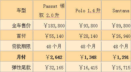 舉一個簡單的例子,如果你參加"彈性信貸購車計劃"購買一款18.38萬元的領馭2.0,首付只需30%,即55,140元;剩下的70%即128,660元中,除掉25%的尾款即32,165元外,其余的部分如果選擇48個月的分期付款方式來支付,那么每個月只要還款2,642元。4年后,你可以選擇把這輛車作為二手車置換給經銷商,還清尾款,并將其余的款項支付新車的首付;或者再把這32,165元分期,在12個月內還清。這種全新的貸款理念大大減輕了消費者的月供壓力,提供了更大的財務空間。而如果按照這樣的方式購買9.38萬元的POLO勁情1.4L,每個月的還款額還不到1,400元。