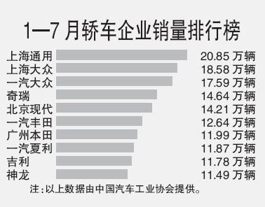 7月,銷量排名前十位的汽車企業(yè)依次為:一汽、上汽、東風(fēng)、北汽長安、華晨、廣汽哈飛奇瑞吉利,分別銷售8.74萬輛、7.87萬輛、6.07萬輛、4.91萬輛、3.48萬輛、1.74萬輛、1.72萬輛、1.70萬輛、1.53萬輛和1.20萬輛,與上月相比除北汽略有增長外,其他企業(yè)均呈下降趨勢,其中長安降幅比較顯著。上述10家企業(yè)7月共銷售汽車38.96萬輛,占汽車銷售總量的83.41%。