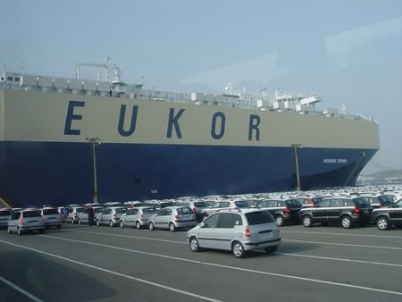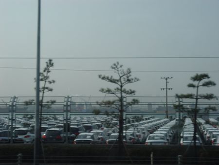 碼頭旁邊停靠著大量準備出口的汽車。