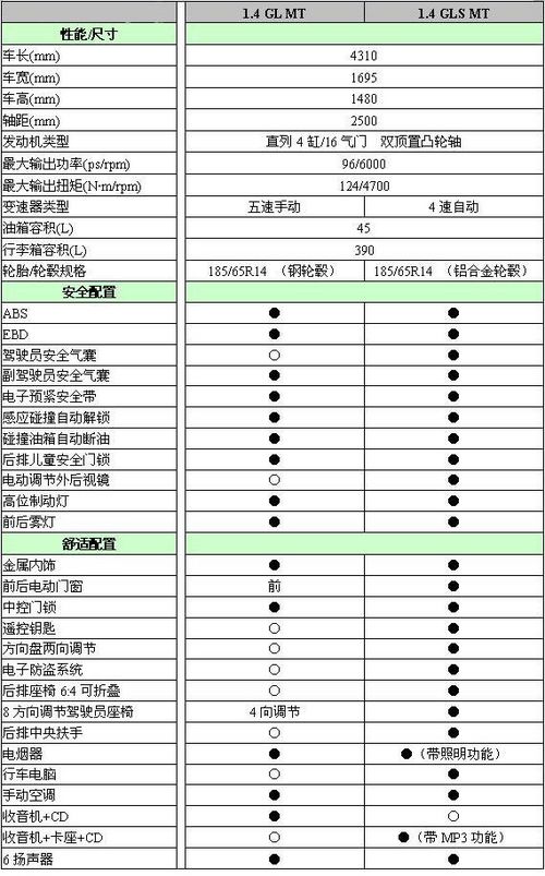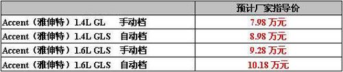 第二點:都是經濟型轎車的東風標致206,作為剛上市的新車型可謂銷量非常好,定單踴躍。標致206共有四款車型,售價分別在8.68萬—10.88萬元之間。此車型全部配備了1.6升發動機,只是在配置和變速箱上有差距。這樣的價格給北京現代雅紳特的定價帶來了壓力。 (東風標致206自動變速箱使用的具有保時捷技術的“Tiptronic” 4速手自一體變速箱,而雅伸特只是使用普通的四速自動變速箱。) 第三點:因為北京版Accent是目前市場上銷售的東風悅達起亞新千里馬的升級車型。新千里馬1.3排量和1. 6排量最高售價分別為7.98萬和9.88萬。所以雅紳特定價應該略高于新千里馬的價格。 現代雅紳特1.6AT GLS (點擊查看)和1.6MT GLS(點擊查看)的詳細參數及配置太平洋汽車網早有報道,下面是現代Accent(雅紳特)1.4 GL MT和1.4 GLS AT詳細參數及配置單: