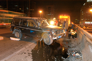 前晚,兩輛跑車飆車經過東三環國貿橋時,其中一車撞上側方的切諾基,導致切諾基橫向飛出,又撞上另一輛皮卡。肇事車迅速駛離現場,交警在高碑店附近發現此車,車內已空無一人。