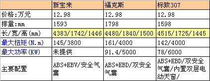 新寶來產品競爭力:新寶來、標致307、福克斯三款車型的最低價格相同,下面筆者僅對這三款車型進行對比。