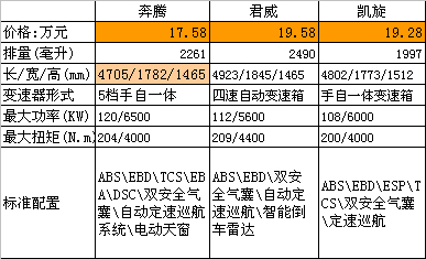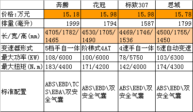 奔騰兩個排量的車型均為手自一體,筆者就奔騰2.0L和2.3L兩個排量的基本款與其競爭對手的相對應車型進行簡單對比: