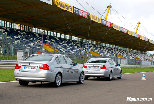 充沛的動力性能和操控需要一套優異的剎車系統作為保障,尤其是在像紐伯格林這樣的F1賽道中,對剎車系統將是嚴峻的考驗。車輛在直道中的最高時速接近200km/h,而進入彎道前又要在準確找到剎車點后讓速度急降(這對于入彎后找到位于彎心的APEX點至關重要),頻繁的如此這般對于一些重度改裝的性能街車也有些難度,而實際過程中,寶馬330i整套剎車系統的熱衰減程度則令人十分滿意。在高速剎車變線和彎道剎車(時速120km/h)的練習中,ABS工作狀態良好(制動時還有DBC和CBC的輔助作用),剎車踏板的彈腳并不明顯,這在第一期寶馬駕駛高級培訓中曾有過體驗。據技術人員稱這是寶馬的新近科技成果。寶馬330i的外觀與內飾的設計與325i和320i的區別不大,配置上也唯有主動式轉向系統及隨動轉向前大燈為330i獨享,因此在這里不做過多贅述。
