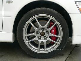 看看EVO IX的輕質量鋁合金輪轂和紅色剎車卡鉗,不必筆者多言,光賣像就知道不簡單,如此的怪獸如果不配置特制的制動系統,當其真正跑動起來的時候車速將很難得到控制。