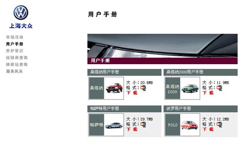 在站點的較多車主頻道都可以查詢到相關的用車信息。特別是在“大眾服務”頻道中可下載各主流車型的用戶手冊,車型包括桑塔納、桑塔納2000、帕薩特、波羅,但沒有區分各種排量和等級的車型。而養護常識欄目則羅列了行車竊門、養護常識、汽車美容、日常保養等情況下的操作指引。