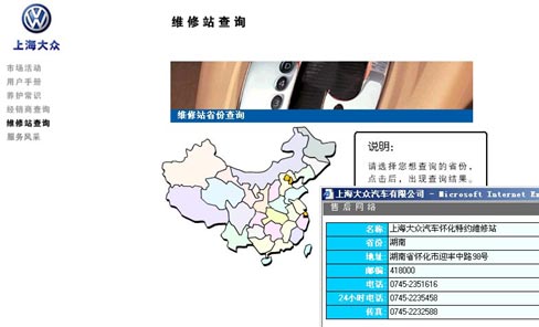 上海大眾的維修站查詢和經銷商查詢頁面是分開的,進入頁面可發現,維修站可分省份查詢,在網頁下端有一個中國地圖區域圖,并按照省份分隔開,點擊目標省份即可在彈出窗口查詢到相關的維修站。此外,在查詢頁面的右端還可以輸入維修站名稱或郵政編碼進行查詢。