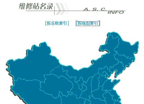 別克的維修站點查詢可在“服務無限”頻道點擊“維修站名錄”進入,頁面提供“按名稱索引”和“按地圖索引”兩種功能。選擇目標網點后回車,站點即在當前頁面打開網點信息,但該層僅羅列網點名稱和地址,用戶尚需點擊網點名稱進入下一層頁面查看地址、郵編、電話、傳真、服務簡介、網站地址等信息。