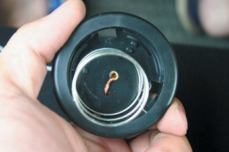 接著將喇叭蓋裝上,并將電線的另一頭綁在喇叭按鈕上的其中一個端子上