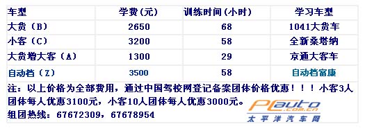 報名條件:   1、小客車、小貨車 身高150cm以上, 年齡18—60周歲。   2、大貨車 身高155cm以上, 年齡18—50周歲。   3、大貨增大客 駕齡滿3年以上 年齡45周歲內。   4、小貨增大貨 年齡50周歲內。   報名手續:   有效身份證或戶口本的原件及復印件。外埠學員須持一年以上暫住證原件及復印件。大貨增駕大客須有本市駕駛證檔案三年以上駕齡。一寸證件照6張,黑白彩色均可。 彩色照片不能是紅底,不能與身份證照片同版。   學習程序:   初學報名后須參加五天法規培訓,考試合格者由學校辦理培訓手續,三個工作日以后領取學習證,正式參加計時培訓,大貨68小時,小客58小時,大貨增大客29小時,經市文管局民警主持樁、路考試合格后約一周發正式駕駛證。   報名咨詢:010-67677114、67672309