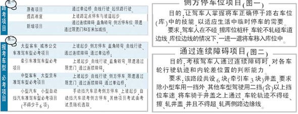 據了解,公安部《機動車駕駛證申領和使用辦法》(71號令)統一規定了在場內道路上駕駛機動車的9個考試項目(見表一),其中新增通過連續障礙、直角轉彎、側方停車位、限速通過限寬門和百米加減擋項目。9個項目按報考的準駕車型分別設定為必考項目(見表二)。