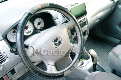日本RAYS 17英寸超輕鋁合金輪轂,和全車24K鍍金的MAZDA車標相映成輝,套上TOYO輪胎(TRAMPIO 215/40 R17)后,路面感覺十分直接,純粹是專業級配備。 掀開超輕質量的碳纖維發動機蓋,一股追隨日系車夸張的改裝風格撲面而來。絳紅色的汽缸蓋顯露出了改裝技師欲染指引擎的野心,但是改裝師考慮到該車更多是日常駕駛,故最終方案只是換裝了日本HKS原裝7度火花塞和V-CHARGER火嘴線。在進氣部位,技師建議選用的是和MAZDA車系匹配效果較好的世界第一品牌的美國K&N高流量原裝位空濾。但是,追求穩定性并不代表吝嗇,指名道姓要使用日本HYPER H.U.S新一代加強型電子整流器來改善全車電流回路系統,還是可以看出車主對改裝的專業精神。