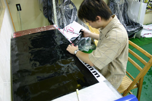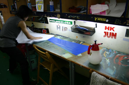 將挑好字的貼紙平放在桌上并撕開背后膠膜,再噴上特殊的黏膠溶劑,便可以準備貼上車身。