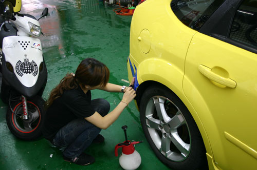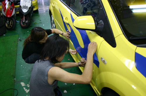 車身上也噴過水后,就將貼紙用上車身。要注意不要沾到沙粒,大面積的貼紙最好多點人一起施工,以免掉到地上或卷在一起。