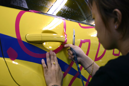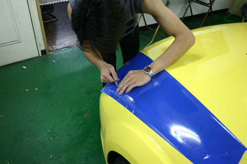 超出車身鈑件的地方用美工刀將多余部分割除,線條是否平順就看施工者的功力了。