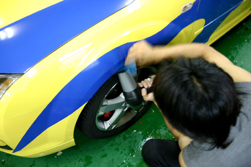 使用熱風機做最后整理,熱風可將無法刮除的水分烘干,并讓貼紙稍微收縮,平順度會更好。