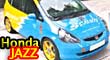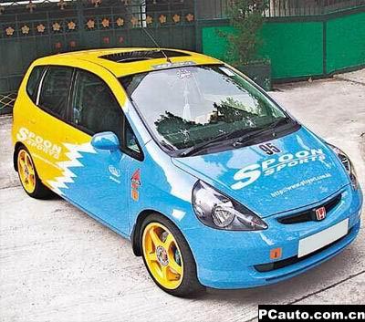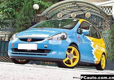 受到一片RV熱潮影響之下,Honda車廠研制新一代的車款,可說是大同小異,流露濃厚RV影子,就如Civic EP3、Stream及Jazz等等。不過,作為小車級別的Jazz,雖然原裝外表比較平凡,但經過全車拉上Spoon Sports比賽版廠花之后,以黃與藍色相襯,觀感立即截然不同,再加上四個黃色17吋ADVAN Racing Touring Competition輪圈,采用T字斷面形狀,并以鍛造設計,達到高剛性、輕量化效果,配合Dunlop Formula FM901 205/40ZR17車胎,充分擠滿在沙板之內,極度散發跑車味道。