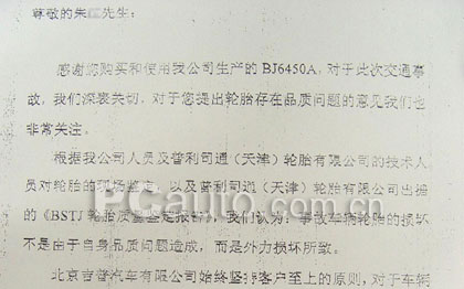 朱先生傳真給太平洋汽車網的鑒定報告資料 2004.2.6,北京吉普汽車公司銷售市場部服務管理科發給我一份傳真,節選如下“根據我公司人員及天津普利司通輪胎的技術人員對輪胎的現場鑒定,以及天津普利司通輪胎有限公司出據的《BSTJ輪胎質量鑒定報告》,車輛事故輪胎的損壞不是由于自身品質造成的,而是外力損壞所至……”事故車由我自己花錢維修。
