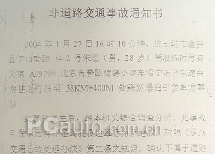 朱先生傳真給太平洋汽車網的《非道路交通事故通知書》證明資料 2004.1.30,泰州市公安局交警支隊寧靖鹽高速公路二大隊為我出據了《非道路交通事故通知書》在此通知書上認定“經本機關綜合認定,此事故引發原因并非是駕駛員違章行為所造成,而是汽車爆胎所致。對照《道路交通事故處理辦法》第二條規定之規定,確認不屬于道路交通事故。根據《中華人民共和國道路交通事故處理程序規定》第十三條第款之規定,認定此事故為非道路交通事故,當事人可以向人民法院提起訴訟。” 2004.2.2,北京吉普汽車有限公司與天津普利司通輪胎有限公司一行4人終于與我見了面。我要求他們公司退還車款或者更換新車,并賠償我的直接損失(因為車輛撞壞了高速公路的隔離帶,我當天賠了6000多元)。 (圖片點擊可放大)