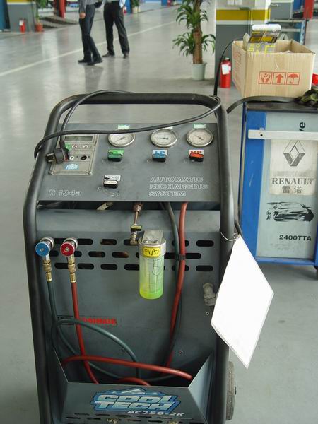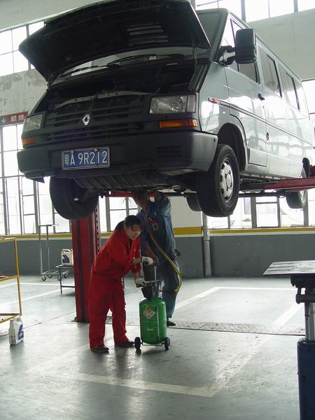 這里還有女維修技師呢,正在用儀器清理油路系統