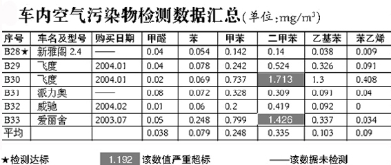 更何況——車內(nèi)空氣污染物也能殺人。2003年12月末的一天,北京有位車主因懷疑某汽車廠生產(chǎn)的新車內(nèi)飾有毒氣體——甲醛超標(biāo),而導(dǎo)致其家屬死亡一事,將廠商告上了法庭,這是國內(nèi)首例因車內(nèi)空氣污染物致死的案件。聞?wù)邌誓懀沧屓藢π萝嚺f車的車內(nèi)空氣污染開始提心吊膽。(相關(guān)事件詳情請點(diǎn)擊:首例廠家被訴車內(nèi)苯超標(biāo)致死案:車主證據(jù)不足被駁回) 勞保所專家介紹說,與苯類似,二甲苯具有麻醉作用,可導(dǎo)致造血器官的損壞并擾亂神經(jīng)系統(tǒng)。其急性中毒的臨床癥狀類似于苯中毒。癥狀有疲乏、頭暈眼花、醉酒、顫抖、呼吸困難,有時還會惡心并嘔吐,更嚴(yán)重時可能失去知覺。二甲苯濃度過高同樣會對行車安全造成隱患。 目前國內(nèi)的汽車內(nèi)飾普遍存在空氣污染問題,只是程度不同而已。由于車內(nèi)空氣質(zhì)量受到購買時間、車內(nèi)裝飾物及車主生活習(xí)慣(如吸煙)等綜合因素影響,本結(jié)果僅供參考。(文中數(shù)據(jù)來源:新京報) 相關(guān)文章:飛度車主談高速表現(xiàn):車身發(fā)飄 噪音讓人心煩