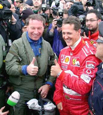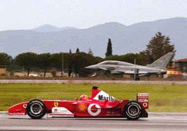 點(diǎn)擊此處,可觀看舒馬赫駕F2003-GA與歐洲超音速戰(zhàn)斗機(jī)較量精彩視頻 北京時(shí)間12月11日傍晚(意大利時(shí)間12月11日星期四早),連奪六次F1世界冠軍的大舒馬赫于意大利空軍基地Grosseto與歐洲超音速戰(zhàn)斗機(jī)(Eurofighter)進(jìn)行了一場(chǎng)較量,在這場(chǎng)較量中舒馬赫駕駛著助他奪得第六次世界冠軍得法拉利戰(zhàn)車F2003-GA與歐洲超音速戰(zhàn)斗機(jī)進(jìn)行三種不同距離的比賽,分別為600、900及1200公尺的直線加速比賽。
