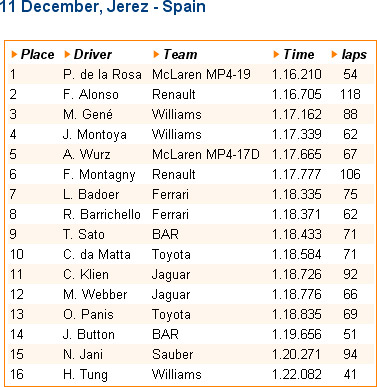 雖然今天的天候還不錯,但賽道路面一直到早上11點才乾。蒙托亞今天都在進行輪胎的測試,不過他對于賽車平衡并不是很滿意,他隊友Marc Gene則在進行引擎耐用度的測試。明天威廉姆斯車隊將進行100圈的測試以模擬比賽周的里程數。