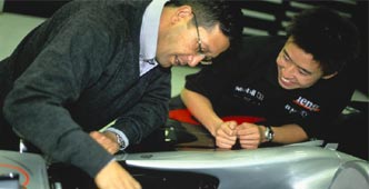 程叢夫在認真聽取測試車隊經理印迪-拉爾的介紹 ”假如能對你的工程師進行高質量并且有用的反饋,這是一項技能,需要在車手生涯中持續發展,” 印迪-拉爾說: “這是至關重要的部分,充分發揮你的賽車性能,而且去利用它以獲得極快圈速。一名車手可以提供有關眾多領域方面的反饋,從在拐彎處的轉向過度,到感覺賽車不能平穩控制而急動,所有這些就能被改進來提高總體速度。因為只有車手感受到這些特征,只有這些特征能提供這種反饋。這聽上去似乎簡單,但是要準確描述實況可能非常困難,我們和小程談論的是這個過程。而他已經有了適當的能力,這是年輕的車手發展中經常忽略的一塊領域, 但是培養是尤其重要的。不能低估:一支車隊和能提供建設性的反饋信息的車手共事,是多么的實際有用。我們也借機向小程詳細介紹一部麥克拉倫F1 (West McLaren Mercedes)賽車。還是如此,開始累計賽車知識對小程來說是很好的,因為作為一名通過方程式進步的車手,這樣就更容易適應。”