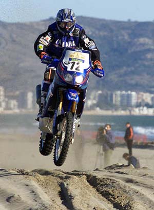 納木訥是法國南部的一個小城,屬于地中海式氣候,昨天這里的天氣變幻無常,時而陰天、時而放晴。由于昨天下過的一場大雪已經基本融化,賽道布滿了淤泥和積水,路況非常糟糕,大部分賽車都濺慢了泥水,這對駕駛員的視線有所影響,來自福特車隊的塞維亞駕駛209號車表現不錯,他以25分鐘的成績領先。駕駛203號車的是法國名將彼德漢賽爾,他也跑出了25分03秒的佳績。意外發生在第48個發車的242號賽車,這輛車因事故壞在了賽道當中,由于路上的淤泥,前來救援的車輛也被困在賽道,組委會不得不臨時終止了比賽,經過緊急協商,組委會決定終至其后的95輛汽車的比賽,按照第46名的成績,時間全部為34分21秒,這樣本應第97為出發的盧寧軍與第53位出發的另一名中國車手羅丁均沒有進行比賽。盧寧軍目前暫列第94位。完成比賽的塞維亞名列第一,彼德漢賽爾列第二,衛冕冠軍曾崗宏暫列第6。 摩托車組的比賽沒有因故中斷,但泥濘的賽道也給不少車手帶來了麻煩,翻車時有發生昨天的亮點當屬亞馬哈車隊的弗雷蒂涅,這位法國人以22分47秒的成績排名第一,打破了KTM車隊的壟斷,名將德斯普萊斯以15秒之差位居此席,前十名中,除了弗雷蒂涅,其余都為KTM車隊車隊車手。 今天的比賽從卡斯特隆進入摩洛哥的丹吉爾,全長865公里,包括9公里的特殊賽段。