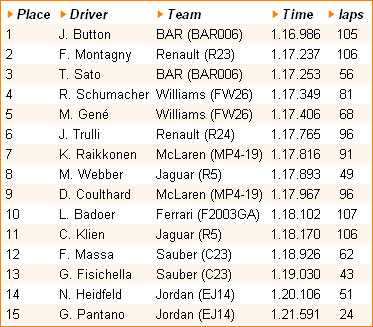 索伯車隊兩名車手今天也都加入了測試行列,但費斯切拉的車發生引擎冒煙的情形,并使得整個電子線路失效,讓費斯切拉不得不提早結束今天的測試。喬丹車隊今天仍然只有一輛新車在場上測試,海費爾德與Giorgio Pantano必須共用同一輛車來進行測試。 2月11日杰雷茲測試結果