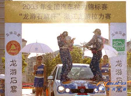 9月7日,2003年全國汽車拉力錦標賽龍游站落下帷幕。由于韶關站因經費問題遺憾取消,而救火隊員河南南陽仍懸而未決,使得本站龍游比賽異常精彩。54臺賽車在共137.77公里的計時賽段中展開撕殺,22臺賽車由于撞車、機械故障等各種原因不幸退賽。最后,實力超群的上海大眾333車隊再一次無可爭議的奪得“廠商杯”、“俱樂部杯”、個人冠亞軍!