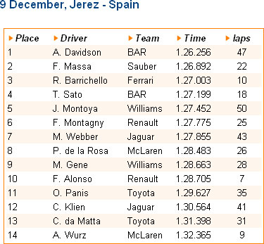 這場豪雨讓米其林陣營(使用米其林輪胎的車隊)無不采用全雨胎進行測試,蒙托亞做出第五快的成績,并與隊友Marc Gene一同進行雨胎調(diào)教的測試。日本車手Satoshi Motoyama原定要在下午為雷諾車隊進行測試,不過雷諾車隊認為天候狀況過于惡劣,因而順延Motoyama的測試。雷諾車隊今天只做了相當短暫的測試,F(xiàn)ranck Montagny測試25圈,而阿隆索只跑了7圈。