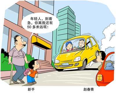 在行車中,突然遇見一個老人橫穿馬路,我急忙踩剎車,車子“吱”的一聲停下了。老人反而安慰我說:“年輕人,別著急,你離我還有50多米遠呢!”