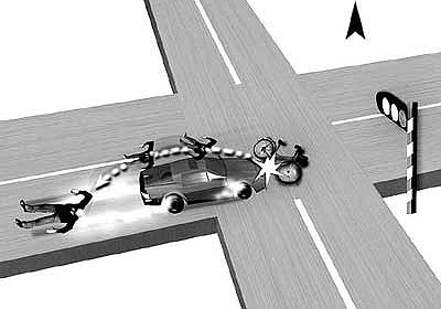 昨天,在朝陽(yáng)交通支隊(duì),記者觀看了事故錄像。時(shí)間是9月19日早晨8點(diǎn)半左右,地點(diǎn)是朝陽(yáng)區(qū)朝陽(yáng)北路團(tuán)結(jié)湖路南口。此時(shí)路口的行人、車(chē)輛不是很多,路面行駛很暢通,由西往東的車(chē)道中為綠燈。在屏幕的左側(cè)兩名騎車(chē)人由北向南想穿過(guò)路口,前面的自行車(chē)停下了,后面的車(chē)卻沒(méi)有停的意思,就在他穿過(guò)路口的時(shí)候,由西向東開(kāi)過(guò)來(lái)一輛灰色吉利車(chē),只聽(tīng)到“砰”的一聲悶響,騎車(chē)人一下子飛了起來(lái),越過(guò)車(chē)頂,翻了3圈,落在了車(chē)后面。全過(guò)程不過(guò)短短幾秒鐘。